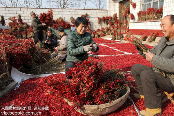 点击下载本组图片 山东无棣县车王镇西屯村群众王金升一家在晾晒朝天椒(高士东/人民图片) (声【详细】