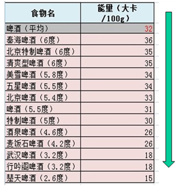 我们不妨做一个计算,看一下啤酒的能量与米饭or馒头相比怎么样?下图是主食与两种常见的啤酒能量值。