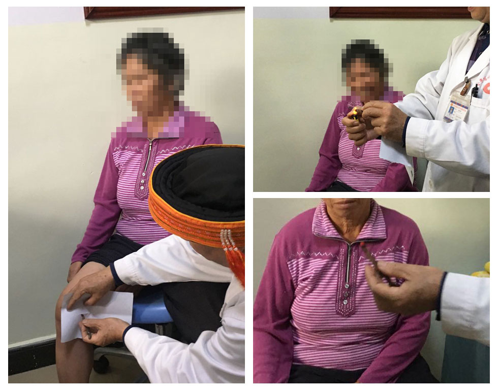 用童尿将断肠草泡制100天,阴干后,隔纸隔姜来对患病部位进行点烧,使药物通过穴位渗透到毛孔,实现驱湿治病的目的。图为广西金秀瑶族自治县瑶医医院医生为病人治疗关节炎。
