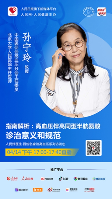 2020年4月14日(周二)17:00-17:40“人民好医生”客户端将邀请中国医促会高血压分会主任委员、北京大学人民医院主任医师 孙宁玲教授进行视频直播,为您解析高血压伴高同型半胱氨酸临床诊治意义和规范。