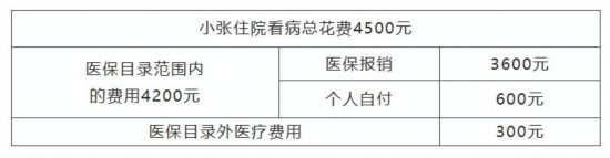 小张在医院住院看病,总花费4500元,其中纳入医保目录的医疗费用4200元,医保报销3600元,医保目录外医疗费用300元。