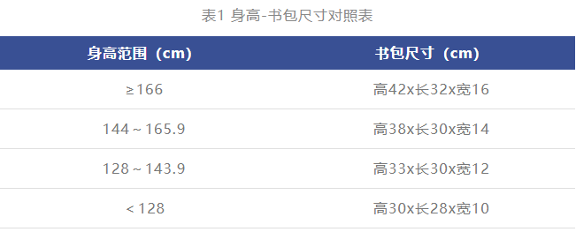 一是科学选择书包。要根据身高选择合适书包尺寸(表1),身高144厘米以下的,可选择配有腰带和胸带的书包,分散重力,防止书包晃动过大造成脊柱伤害。