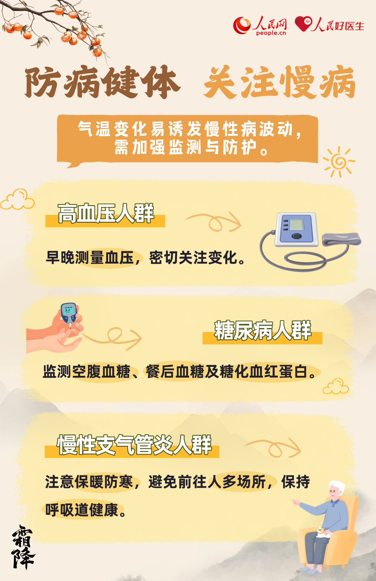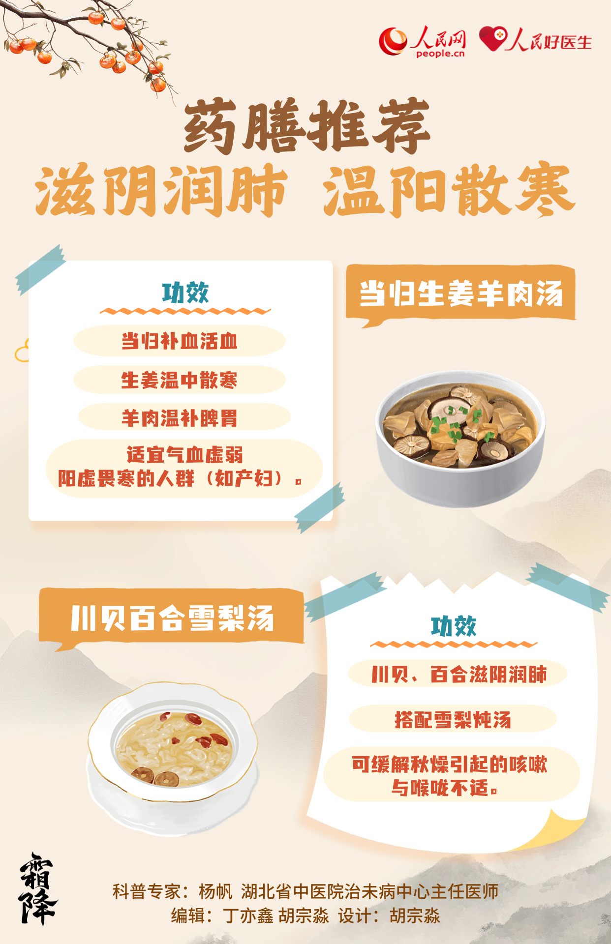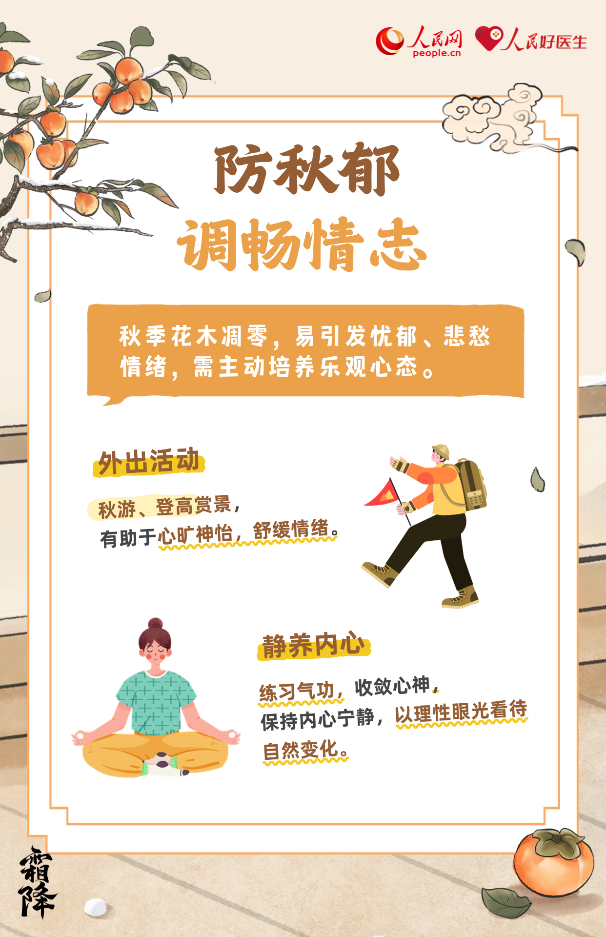 霜降,是二十四节气中的第十八个节气,也是秋季最后一个节气。气温骤降、昼夜温差大。养生当以“防寒润燥,滋阴温阳”为重点,此时节要做好养生保健,无论起居养生还是运动调养都应谨慎,湖北省中医院治未病中心主任医师杨帆为大家带来深秋养生攻略。